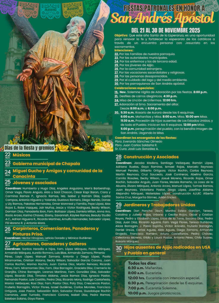 Cada noviembre, Ajijic se convierte en un escenario donde la fe y la celebración caminan juntas. Este Pueblo Mágico, conocido por su belleza a orillas del Lago de Chapala, vive su fiesta más profunda y emocionante: las Fiestas Patronales de San Andrés Apóstol, nueve días donde los cohetes anuncian el amanecer, los danzantes llenan las calles y la música se mezcla con el aroma a flores y antojitos.